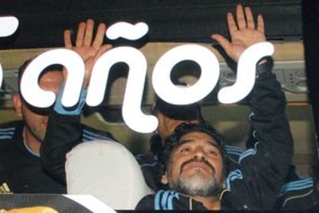 Pero el más ovacionado fue Maradona, quien, ante tanta muestra de devoción, saludaba entre risas, mientras los hinchas le pedían que continura como entrenador del seleccionado al grito de "Diego no se va, Diego no se va". Hasta una enorme bandera con la leyenda "Diego no te vayas" cruzaba la calle justo en el momento en que el ómnibus ingresaba al predio.