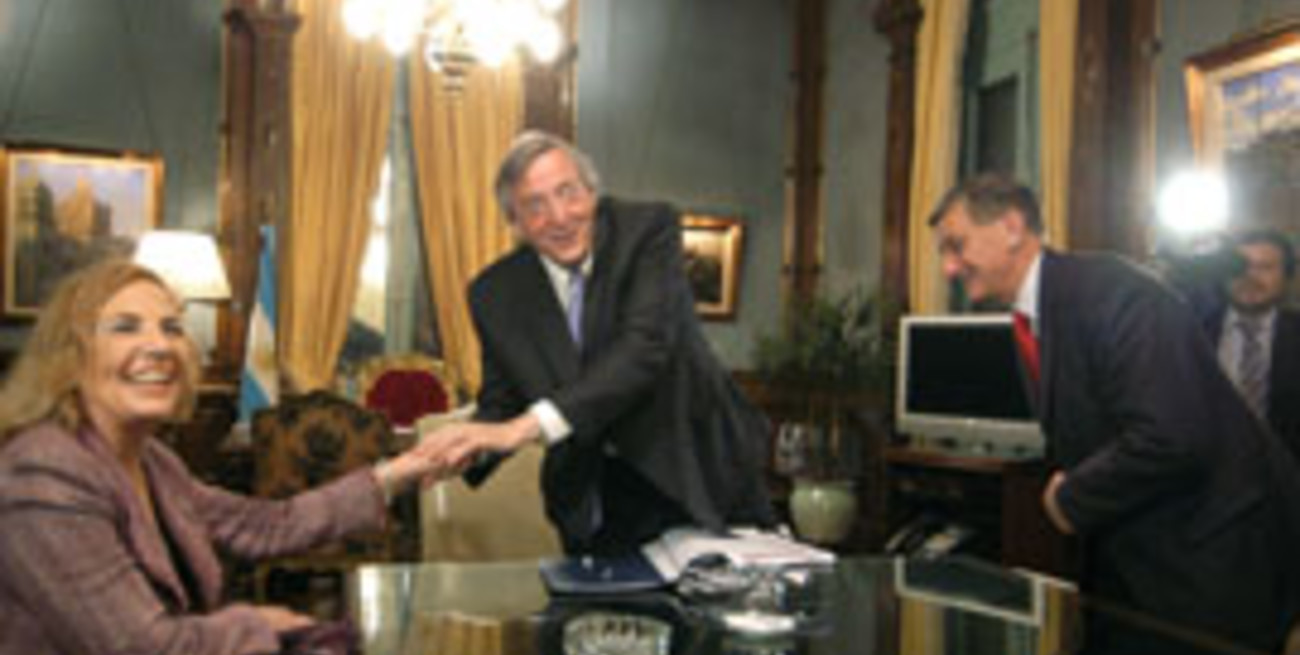 Además de Kirchner, Binner y Tessio, de la reunión que se realizó en el despacho presidencial participaron el jefe de Gabinete, Alberto Fernández, y su vice, el también socialista Jorge Rivas. (Télam).