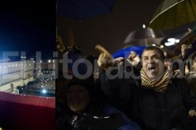 Muchos cerraron sus paraguas y se empaparon para ver mejor la densa columna de humo bajo la intensa lluvia que caía sobre la anochecida plaza.