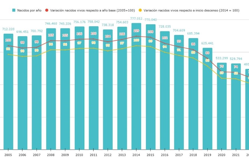 La cantidad de nacidos vivos cayó un 36% entre 2014 y 2022. La cifra bajó de 777.012 a 495.295 nacimientos por año en 8 años. Esa tendencia demográfica ya está impactando en el sistema educativo, y se espera una caída de alrededor del 31% en la matrícula escolar en los próximos años.