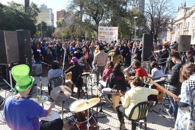 Durante una jornada pública de protesta, realizada este jueves en la Plaza San Martín, la comunidad educativa de la Escuela Provincial de Música Nº 9902 CREI volvió a reclamar por su edificio propio, con una muestra de expresiones, intervenciones y danzas. Fue en el marco de una manifestación convocada por el gremio Amsafé, durante el segundo día de paro docente de esta semana.