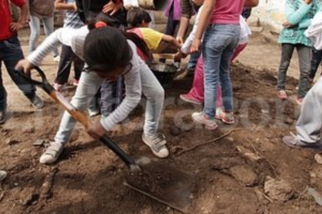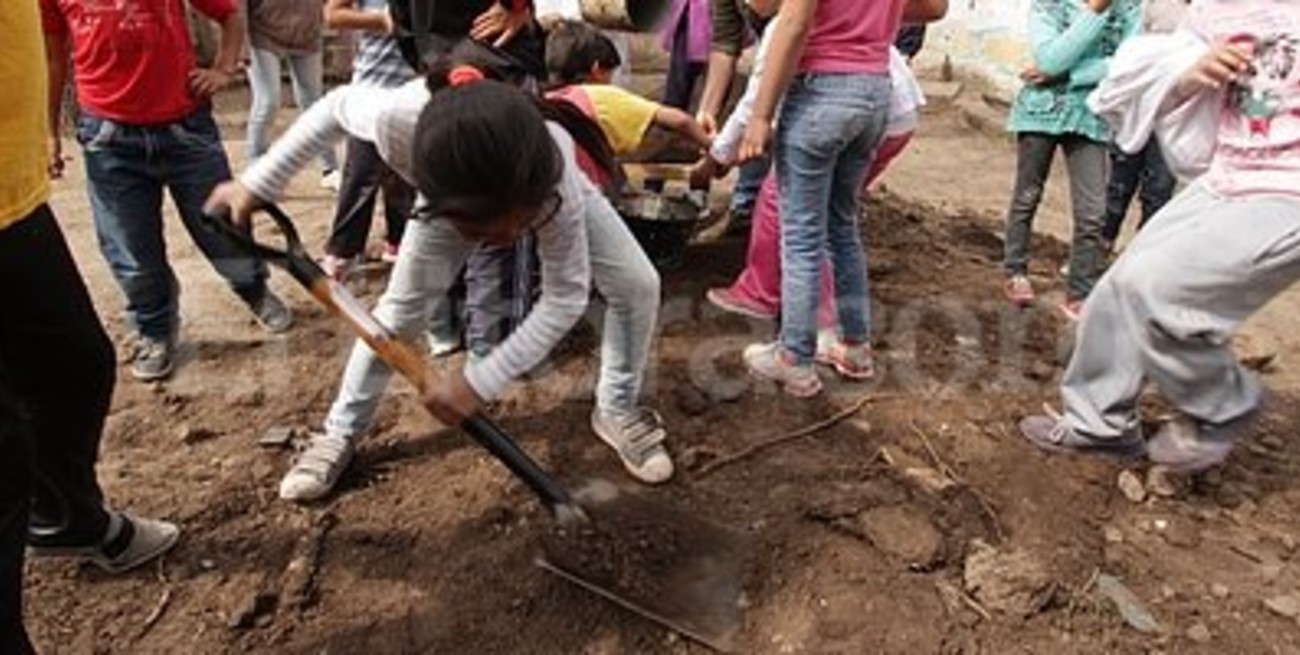 “La base está”. El director del Taller Manual 181 llevaba la batuta del grupo infantil que ponía ladrillos para cimentar el horno. Foto: Guillermo Di Salvatore