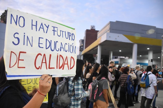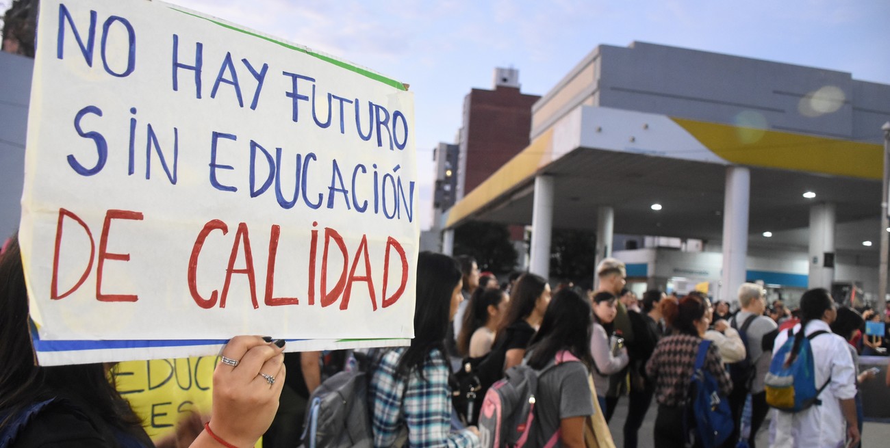 Estudiantes y docentes del Instituto Superior de Profesorado Nº 8 Almirante Brown se manifestaron en inmediaciones de Bulevar Pellegrini y 25 de Mayo. Crédito: Manuel Fabatía.