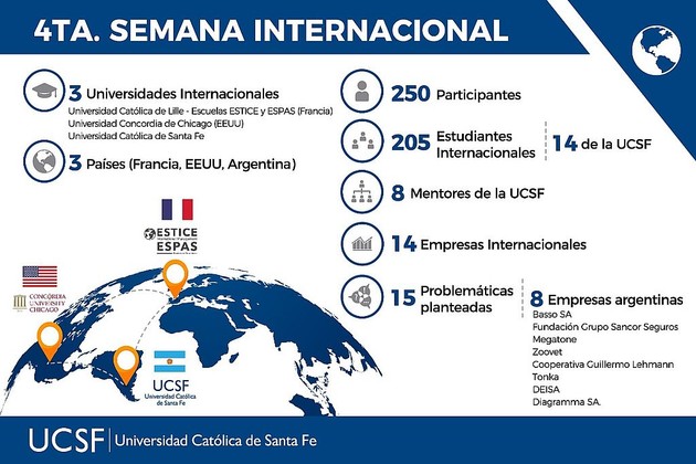 Así, gracias al incansable trabajo del Área de Cooperación Internacional, la UCSF participó de la 4ta. Semana Internacional "Business vs. Global Pandemic", que por primera vez se realizó de manera virtual. Lo hizo junto a la Universidad Católica de Lille (Francia), a través de sus escuelas ESTICE y ESPAS, y la Universidad Concordia de Chicago (EEUU).