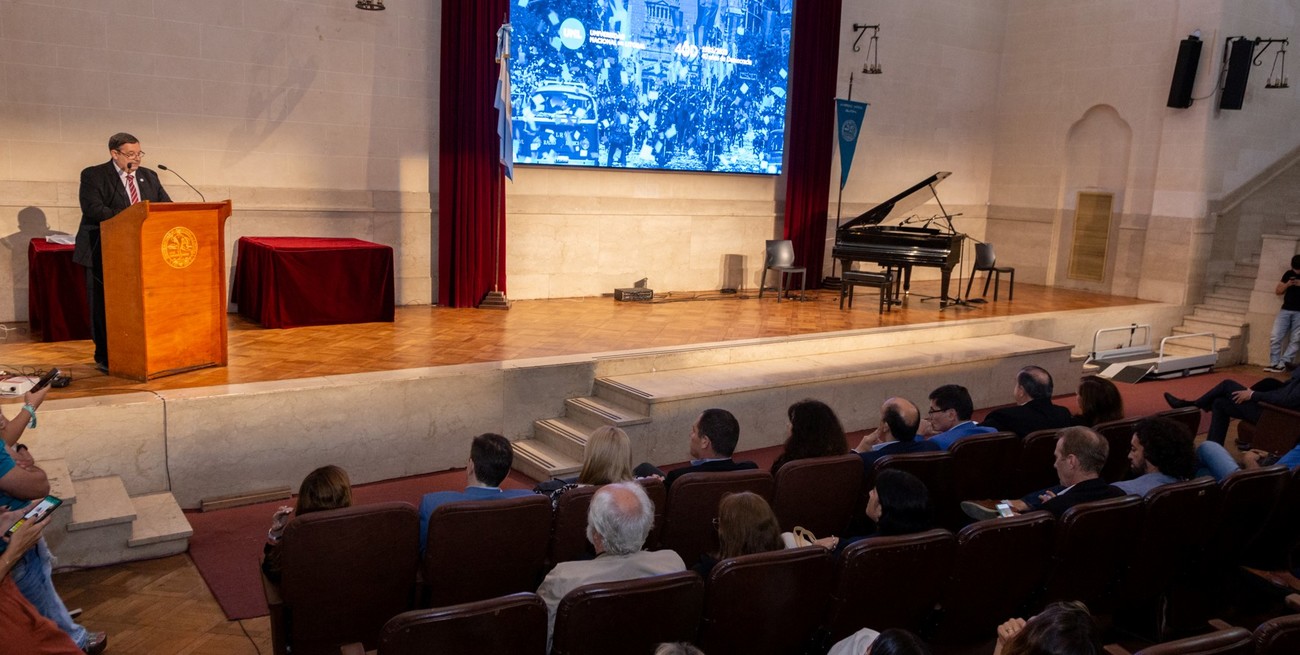 Este acto central de la agenda por el 40° aniversario de Democracia Constitucional se desarrolló en el Paraninfo, recinto emblemático construido para el funcionamiento del órgano máximo de gobierno de la Universidad, la Asamblea, y es el recinto en el que desde su inauguración el 23 de abril de 1938 ha albergado numerosas actividades académicas, artísticas, científicas y culturales, así como también ha sido testigo de acontecimientos sociales y políticos fundamentales en la historia de nuestra ciudad, nuestra provincia y nuestro país que reafirman la dimensión pública de nuestra Universidad. Entre otros hechos históricos trascendentes para nuestra democracia, el Paraninfo fue sede de la Convención Constituyente de 1957, asimismo albergó a la convención constituyente de 1994 y fue sede en 2019 del primer debate presidencial y posibilitó una histórica sesión de la Cámara de Diputados en 2020 durante la emergencia COVID.