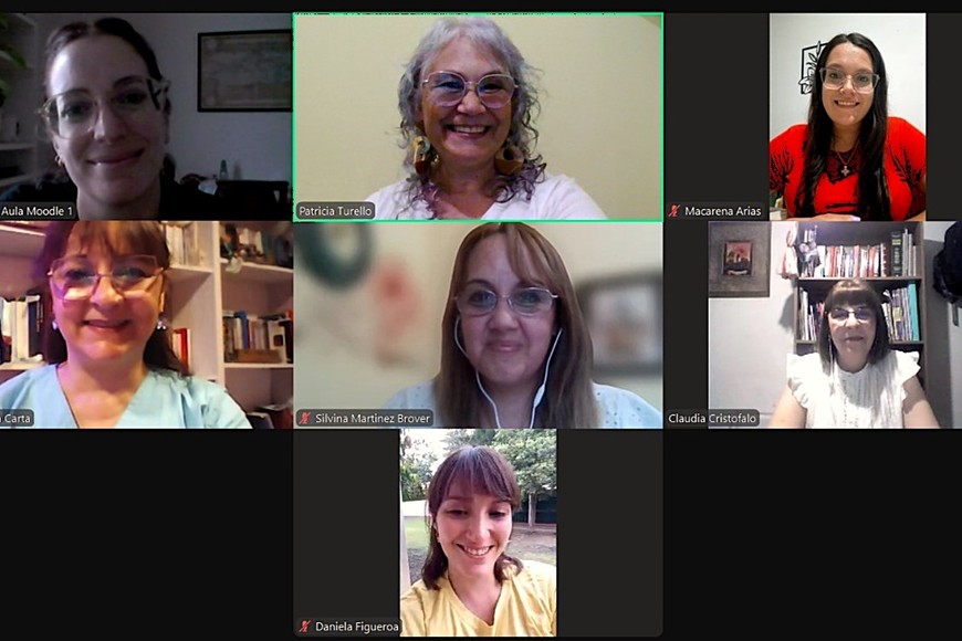 Claudia Cristófalo en la defensa virtual de su trabajo final de la licenciatura (segunda fila a la derecha).
