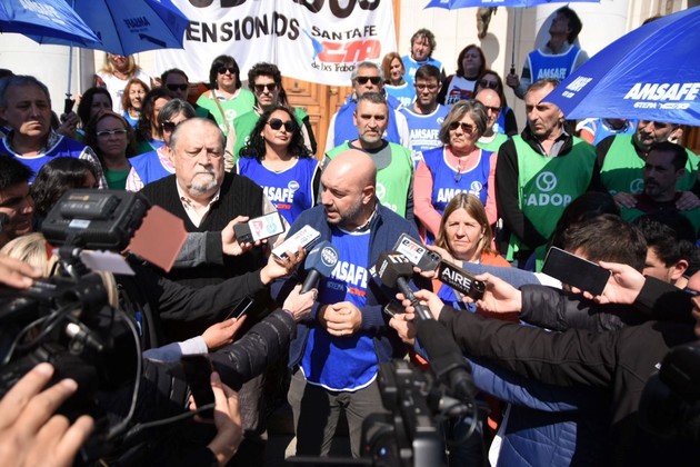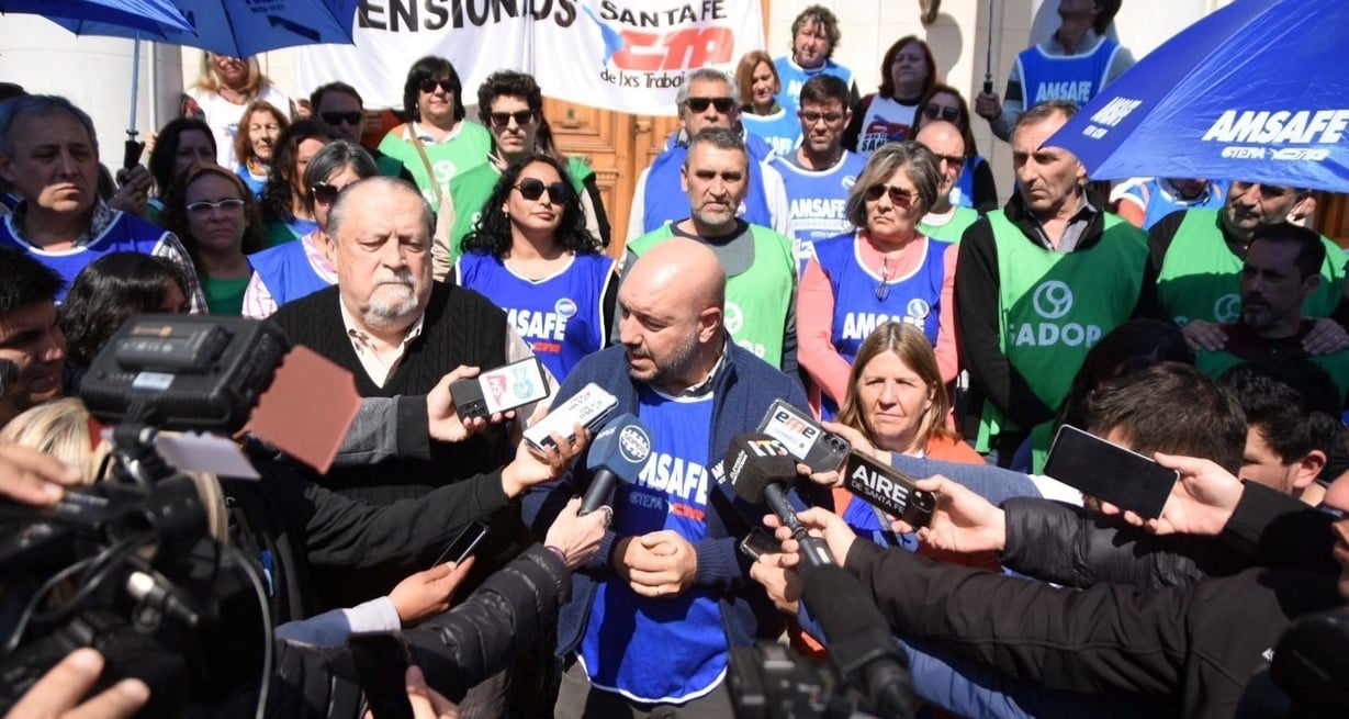 Los gremios docentes Amsafe y Sadop expresaron su rechazo, tras haber tomado conocimiento del proyecto de reforma previsional enviado este jueves por el gobernador a la Legislatura provincial. Así lo expusieron este mediodía frente al edificio legislativo, donde realizaron una conferencia de prensa para expresar su posicionamiento. No descartaron que puedan venir una movilización provincial y un paro.