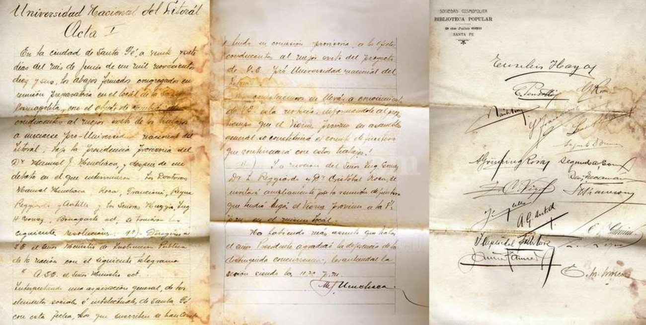 Ese día de junio hubo una asamblea donde participaron 42 personas en la sede de la Sociedad Cosmopolita (hoy Biblioteca Gálvez). Eran representantes estudiantiles, profesores, intelectuales, políticos y miembros de la logia masónica Armonía. En ese encuentro se redactó y firmó el Acta I Pro-Universidad Nacional del Litoral, primer antecedente tangible que acredita la fundación de esa casa de estudios.
