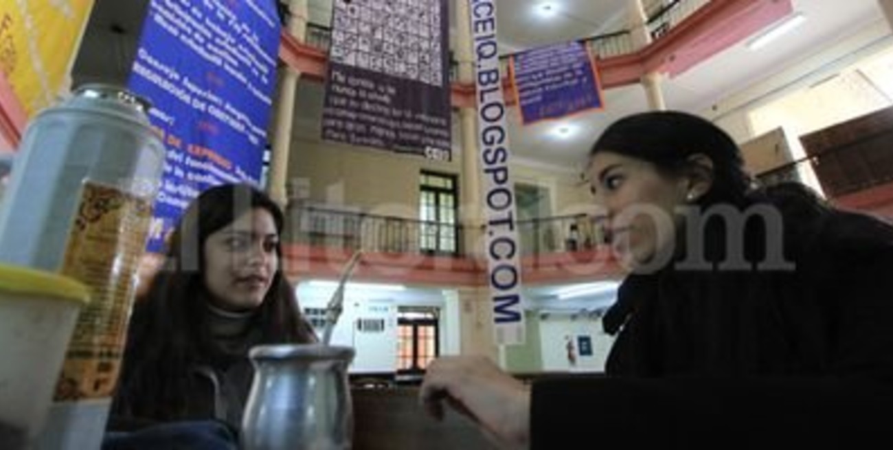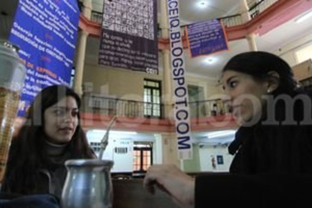Desde arriba del octógono, caen carteles y afiches con mensajes partidarios, que gritan reivindicaciones o reclaman cambios: es un batalla semiológica silenciosa pero feroz. En uno de esos mensajes se pide una “nueva cantina estudiantil”, con menú más barato y variado. En otro se advierte sobre “virtudes y falencias” del plan de estudios de una de las carreras que se dictan. Petróleo y política energética, minería a cielo abierto, la nacionalización de YPF o el conflicto local con la empresa Naranpol, son algunos de los temas de coyuntura que movilizan los debates del estudiantado universitario.