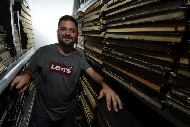 Como pez en el agua. En su visita al diario, el mejor promedio de historia se dio el gusto de navegar unos minutos en los ríos de tinta que hacen los archivos de El Litoral. Crédito: Mauricio Garín