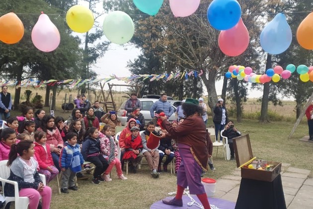 A la “Escuela que rueda” también se suma Galupa, un payaso histriónico que, junto a Mario, provoca la risa de todos los presentes y homenajea a las infancias rurales al son de las músicas del Chango Spasiuk y de Tarragó Ros, que invitan a levantar polvareda en los patios de tierra al ritmo del sapucai.