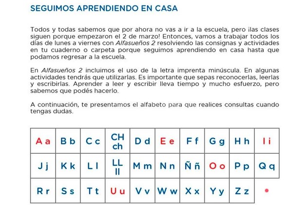 El ministerio de Educación de Santa Fe elaboró material didáctico propio para estudiantes de los tres niveles (inicial, primario y secundario) para subsanar la brecha digital. Los cuadernillos “Seguimos aprendiendo desde casa” -que están siendo distribuidos a lo largo de la provincia y que también se encuentran disponibles en Internet para su descarga- fueron el centro de críticas por incorporar en el abecedario los dígrafos “CH” y “LL”. En función de las observaciones, la cartera provincial ratificó el alfabeto destinado a las escuelas primarias: “Se acordó la incorporación, justamente, por tratarse de una fuente de información que necesitan niños y niñas de 6 a 7 años que empiezan el aprendizaje sistemático de la lectura y escritura”, aclararon por medio de un comunicado oficial.