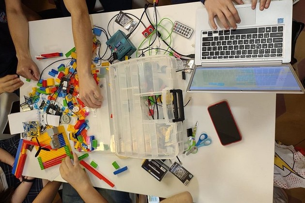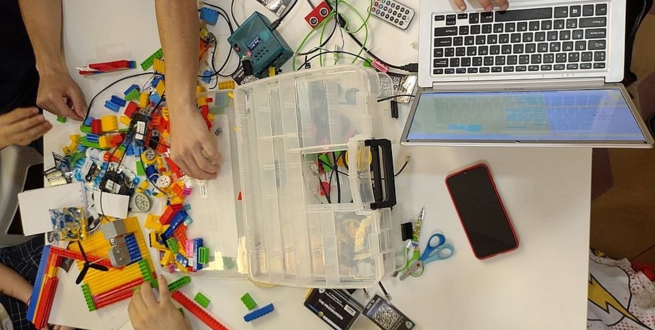 Cada equipo recibió un kit con herramientas con sensores, motor, pilas. También, sumaron elementos extra como tapitas, cables, sogas, cintas, plasticola, cartones, alambre, entre otros que se les iban ocurriendo. La meta fue resolver el problema, aplicando nociones previas de las distintas materias básicas, desarrollando a la vez una pedagogía activa.