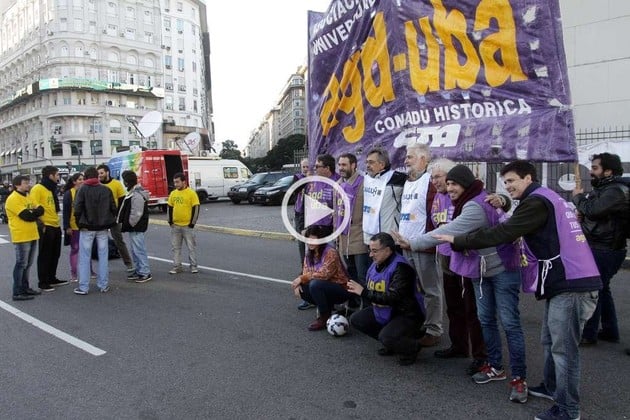 Fue a la mañana, a eso de las 10, en el cruce de 9 de Julio y Corrientes, con el Obelisco como imponente telón detrás y el caos vehicular porteño. Representantes de la Asociación Gremial Docente de la UBA (AGD UBA), de Fuba y de Conadu Histórica (Conaduh), entre otros, jugaron un partido de fútbol “simbólico” de protesta. Se midieron el equipo del “ajuste” y el de la “docencia universitaria”. Ganó 4 a 0 el segundo.
