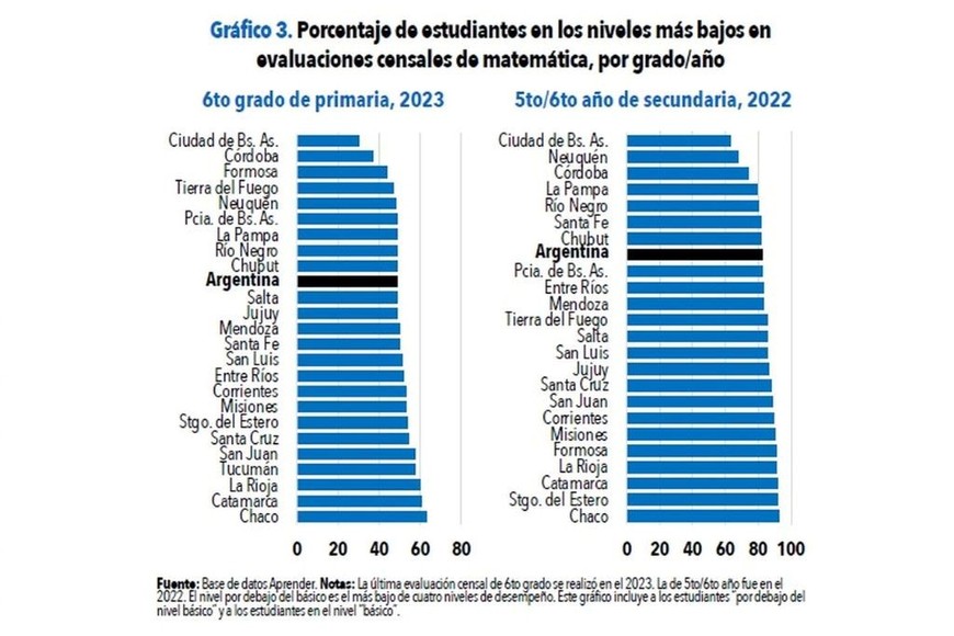 Mientras tanto, el porcentaje de estudiantes que alcanza aprendizajes de excelencia es pequeño: entre 1 y 3 de cada 10 estudiantes se desempeñan en el nivel avanzado. Estas cifras han disminuido con respecto a 2016 y son mucho más bajas aún en las pruebas internacionales. En Matemática, en el último año de secundaria, la mitad de las jurisdicciones argentinas no tiene estudiantes en el nivel más alto.