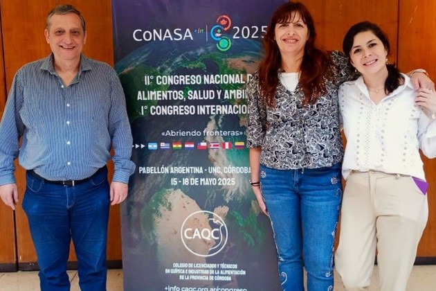 La directora de la LSA, María T. Benzzo (medios), junto a los egresados José Pajón y Mónica Zapata, en el II Congreso Nacional de Alimentos, Salud y Ambiente 2025. Foto: Gentileza UCSF.