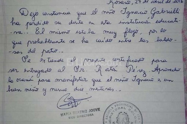 “Dejo constancia que el niño Ignacio Gabrielli ha perdido su diente en esta institución educativa. El mismo estaba muy flojo por lo que probablemente se ha caído entre las baldosas del patio. Se extiende el presente certificado para ser entregado al Sr. Ratón Pérez. Aprovecho la ocasión para manifestar que Ignacio es un buen niño y nunca dice mentiras”, dice la comunicación, escrita muy formalmente por cierto y firmada por la docente.