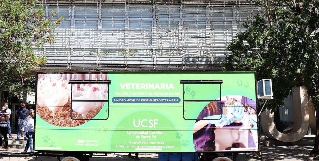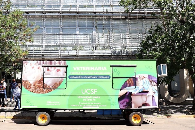 La Universidad Católica de Santa Fe presentó la flamante Unidad Móvil de Enseñanza Veterinaria de la Facultad de Ciencias Agropecuarias, que tendrá como principal finalidad desarrollar actividades académicas y de investigación en la Sede Reconquista. En primer término, el Museo Etnográfico y el convento de San Francisco dieron marco para la presentación junto al ministro de Producción, Ciencia y Tecnología de la Provincia, Daniel Costamagna; el presidente del Directorio, Armando De Feo; el rector de la UCSF, Eugenio Martín De Palma; el delegado del Rector para la FCA, Roberto Pauli; el secretario de Gestión Estratégica, Néstor Dona; y el Secretario de Gestión de la FCA, Max Grether. Seguidamente, la UMEV se trasladó a la sede de la UCSF para su bendición en presencia de representantes de los gremios APUC y ADUC, autoridades y personal.