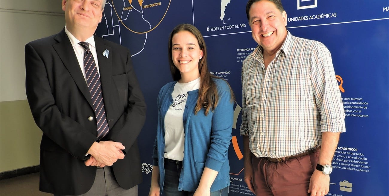 La flamante egresada, Agostina Piriz, fue felicitada personalmente por el rector de la UCSF Eugenio Martín De Palma y el delegado de la Facultad de Ciencias de la Salud, Daniel Vicens.