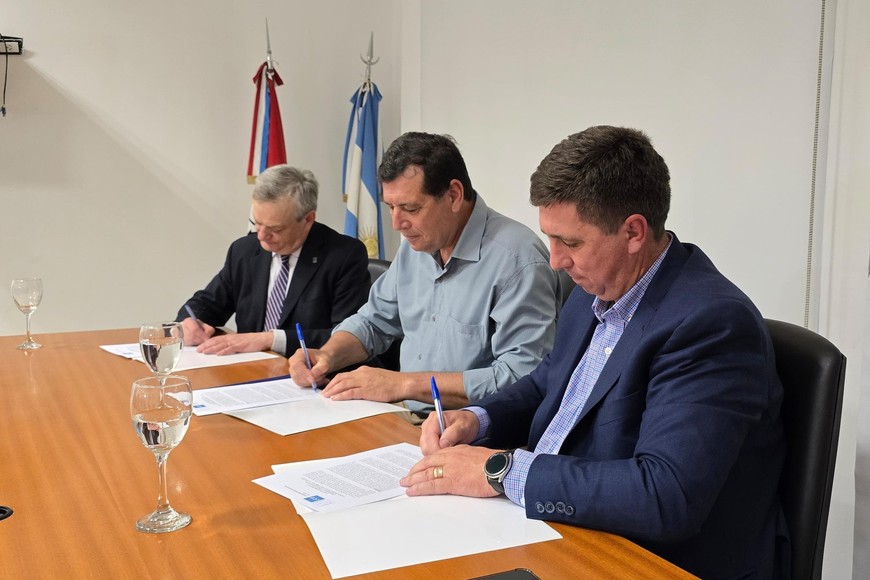 De Palma, Mathey y Pirola durante la firma del convenio basado en la iniciativa que la UCSF promueve en sus sedes de Santa Fe, Entre Ríos y Misiones.