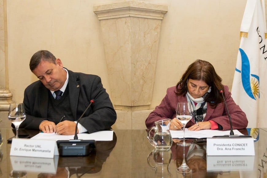 El rector de la UNL, Enrique Mammarella, junto a la titular del Conicet, Ana Franchi, firmaron el convenio donde la UNL le transfiere al Conicet el 50% de su paquete accionario.