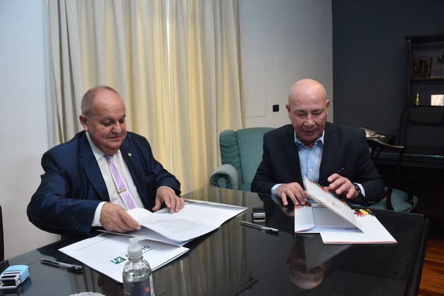 Durante la firma del convenio estuvieron presentes Oscar Matiller, representando a la Universidad Siglo 21 y Jorge Molina, secretario General de UPCN. Crédito: Flavio Raina.