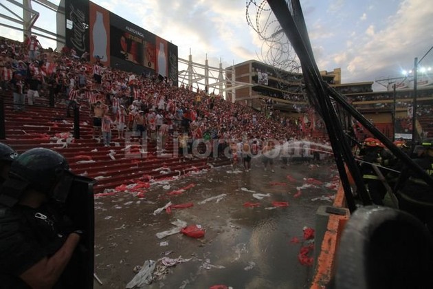 Pasó lo que todos los que miraban el partido por tv temieron, vino el segundo gol de Colón y la hinchada visitante se exacerbó, los incidentes se multiplicaron, hubo represión policial y el partido estuvo a punto de suspenderse, pero nuevamente el jefe del operativo policial y el árbitro decidieron continuar el partido y así poder terminar.