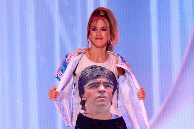 La cordobesa saludó con un brazo en alto y apoyó la pelota en el piso, para empezar a llevarla con su pie izquierdo, al mejor estilo Diego. Después se frenó, se abrió la camisa -de lentejuelas brillantes, celestes y blancas- y dejó ver una remera blanca con la cara de Diego.