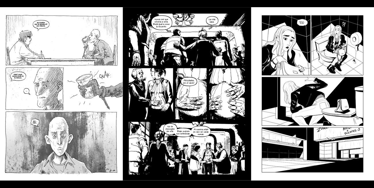 La parte dos comienza con “Voz” de Guido Barsi y Luisina Módica, narración que se desarrolla en un solo lugar y que tiene apenas un protagonista. O dos…quizás tres. Una joven queda encerrada en un pequeño baño a merced de sus propios demonios y pensamientos. Seguramente sea el trabajo al que mejor le sienta el uso del blanco y negro, sus páginas brindan la sensación de pulcritud así como de prisión con unas viñetas dispuestas de forma demasiado prolija. Así, los creadores deslizan la idea de que todo está en el lugar correcto, claro todo menos la propia mente.