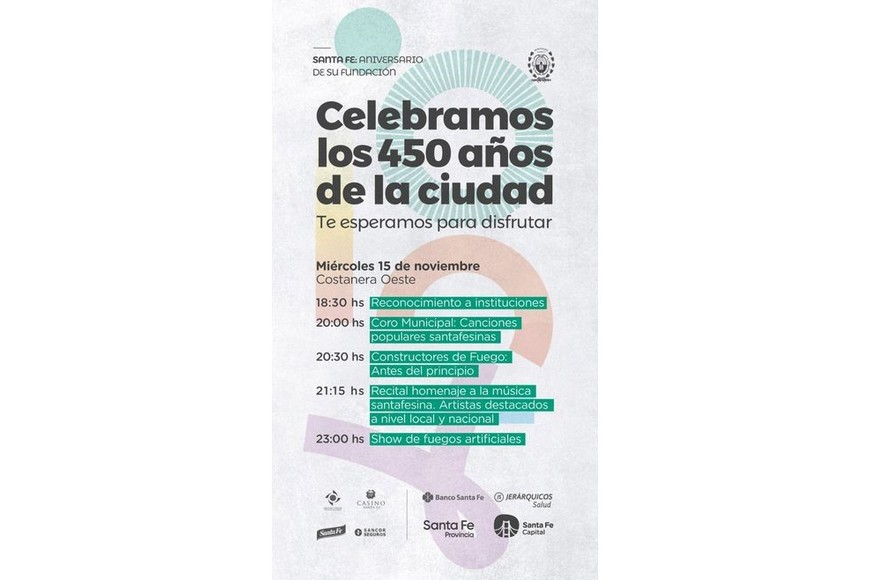 Las expectativas crecen hora tras hora. Solamente es cuestión de un puñado de días para que la ciudad de Santa Fe llegue al día tan ansiado, en el cual se festejan sus 450 años de vida. En ese marco, el próximo miércoles se realizará una gran fiesta en la Costanera Oeste que incluirá, dentro de una amplia propuesta, música y espectáculos inéditos en la región. Que fueron pensados y diagramados de manera sintonizada entre la Municipalidad y el gobierno provincial para proponer una fiesta a la altura de las circunstancias.