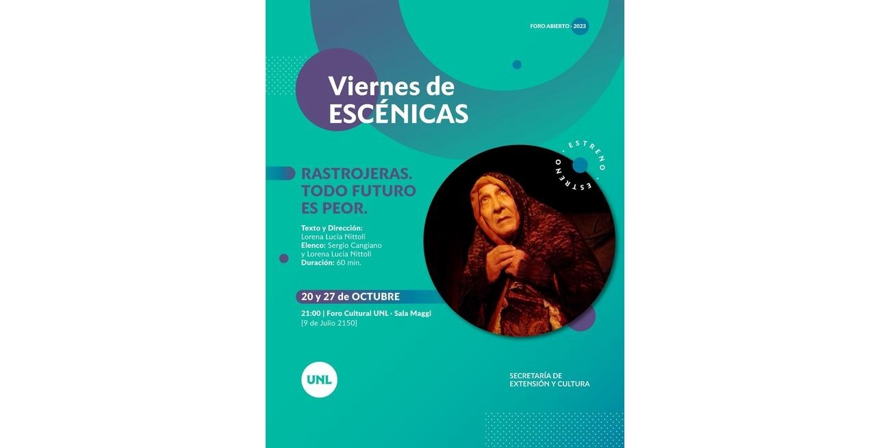 "Rastrojeras. Todo futuro es peor” tendrá su estreno este viernes 20 de octubre en el Foro UNL, puntualmente en la Sala Maggi (9 de Julio 2150). Con dirección y dramaturgia de Lorena L. Nittoli, la obra promete un viaje absurdo y enajenado por el subterráneo de la mente humana.