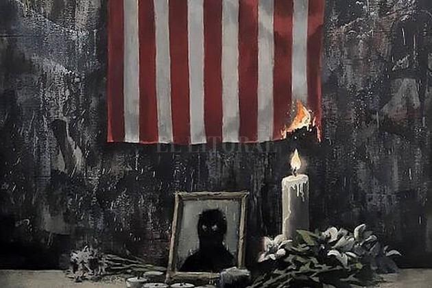 El artista británico Banksy publicó hoy en su cuenta oficial de instagram una imagen de la bandera de Estados Unidos empezando a quemarse por la llama de una vela de una ofrenda fúnebre, cuyo retrato sólo muestra una silueta sin boca ni expresiones, solo los ojos, acompañada por un texto en homenaje al afroamericano George Floyd asesinado a manos de la policía.
