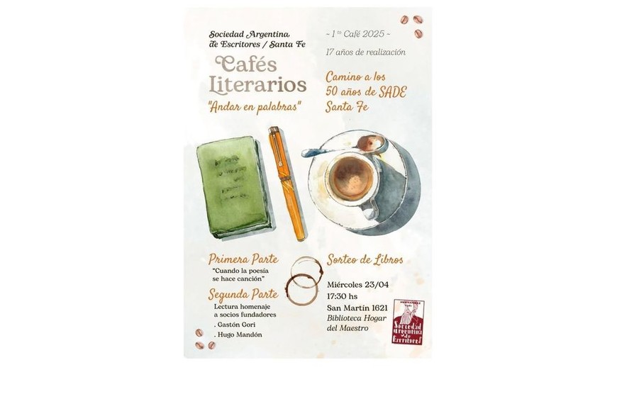 El próximo 23 de abril, la Sociedad Argentina de Escritores (SADE) filial Santa Fe realizará un nuevo encuentro en el marco de los Cafés Literarios que llevan como título general "Andar en palabras".