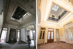 También se realizó el saneamiento, adecuación y restauración de mansardas; el tratamiento integral de fachadas; la recuperación de las ornamentaciones originales, trabajos de carpintería, herrería, revestimiento, arreglo de pisos, vitraux y todos los elementos originales de la casa.