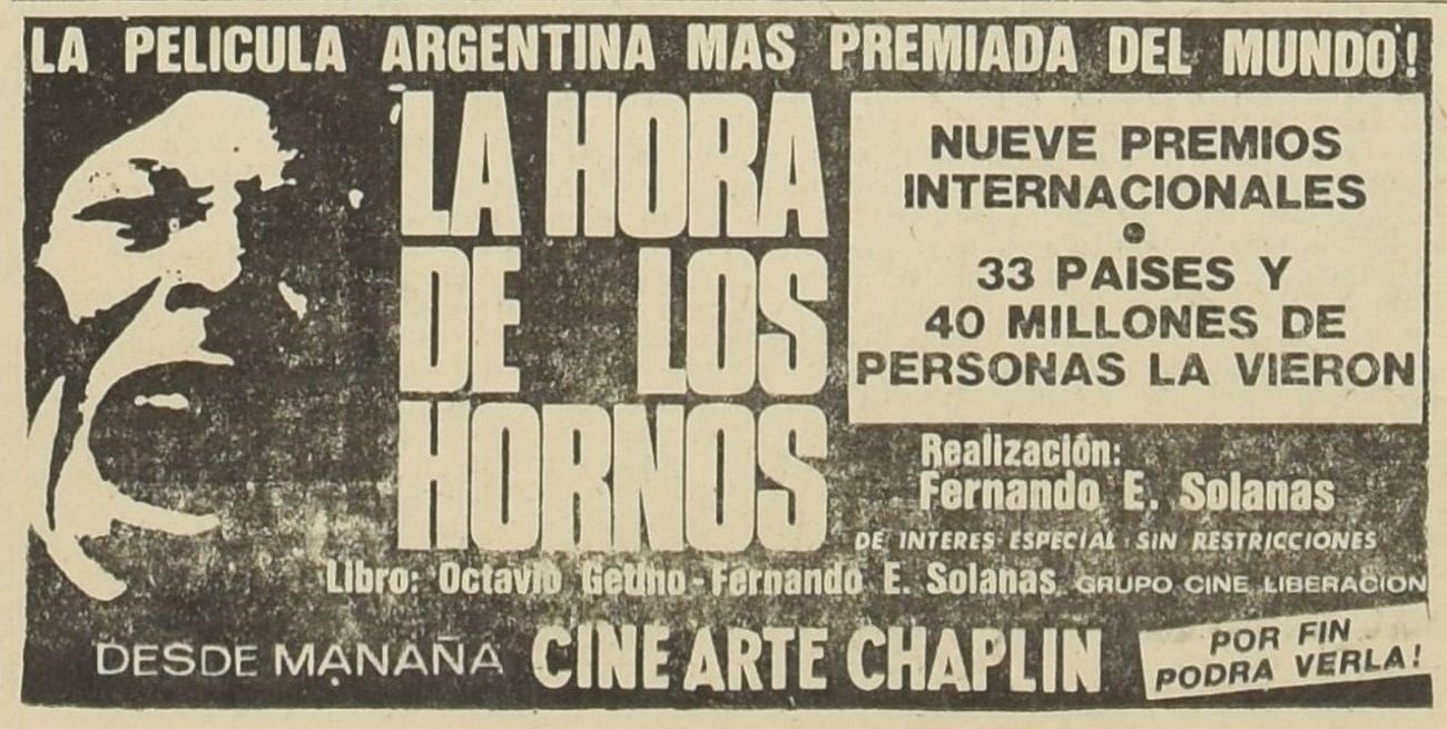 Era un tiempo en que el cine era capaz de conmover y a la vez plantear consignas. En que las películas argentinas inspiraban a los europeos como modelos de acción política y artística. "La hora de los hornos", de 1968, pero estrenada recién en 1973, fue el punto más alto de esa especie de "impulso".