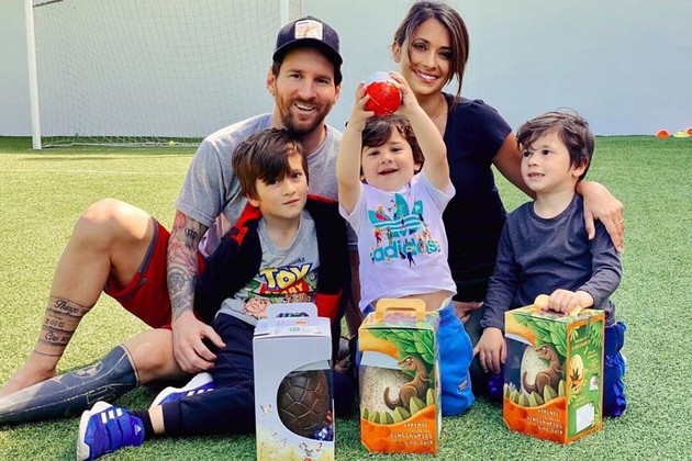 En la imagen, se observa a Lio y Antonela junto a sus hijos, todos con su caja que contiene un huevo de pascua y, un juguete de dinosaurio. Por otra parte, Ciro sostiene otro huevo de chocolate.