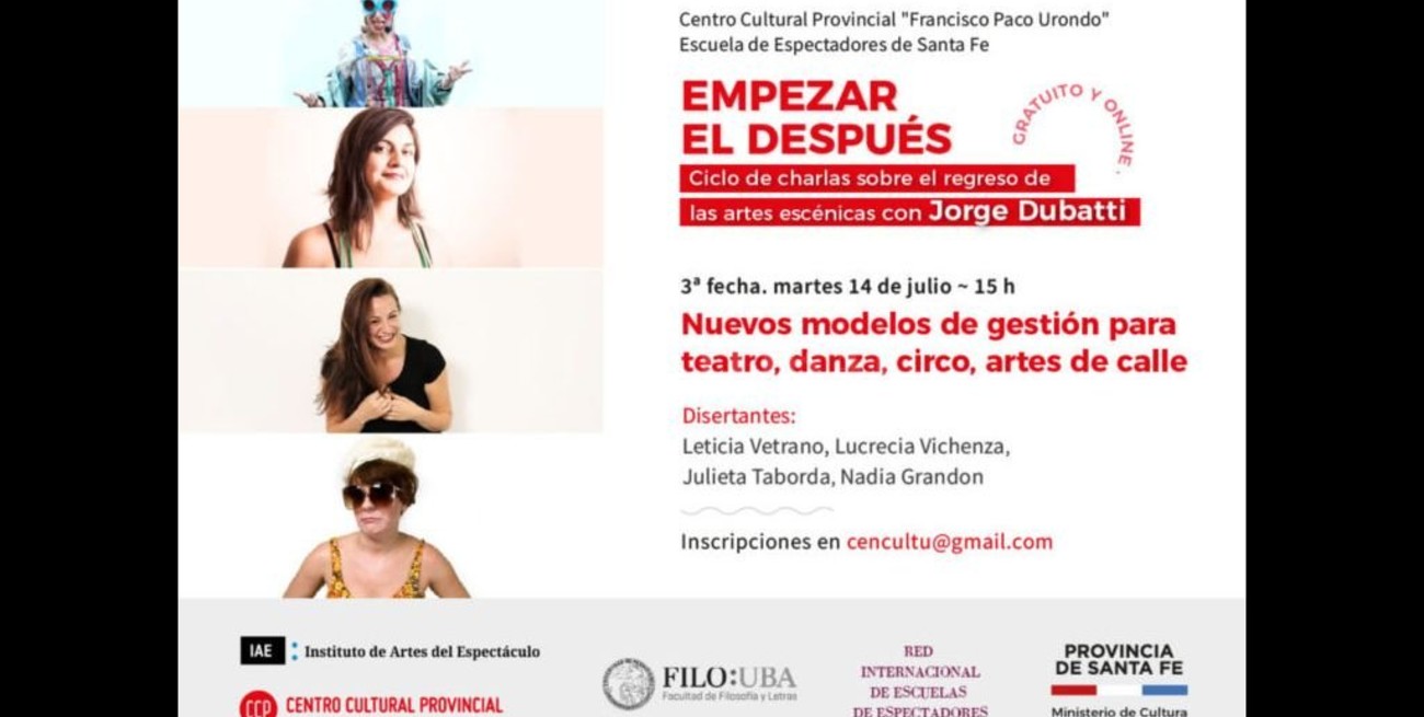 La Escuela de Espectadores de Santa Fe presenta la charla "Nuevos modelos de gestión para teatro, danza, circo y artes de calle", se realizará on line el próximo martes 14 de julio a las 15.