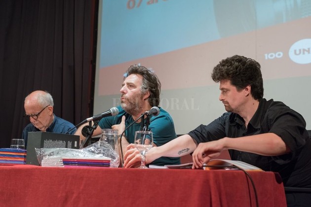 Gentileza Taller de Cine de la UNL Mariano Llinás (centro) durante una de las mesas de discusión que se dispusieron durante el encuentro, para afrontar diversos temas, en especial las perspectivas del cine hacia el futuro. Lo acompañan Raúl Beceyro y Agustín Falco.