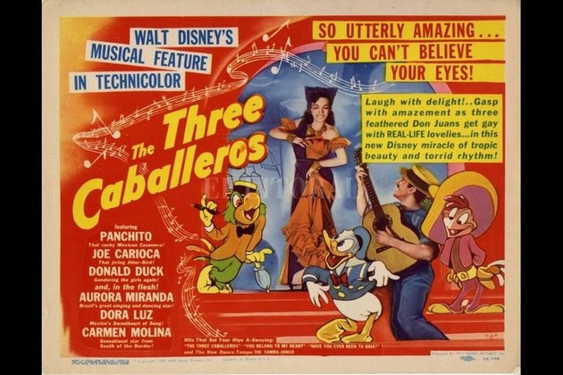 “Los tres caballeros” (1944): una de las primeras veces que Walt Disney volvió la mirada hacia América Latina fue en 1940, cuando introdujo al personaje de José Carioca. Cuatro años después, sobre el final de la Segunda Guerra Mundial, agregó al gallo Panchito (personaje mexicano basado en estereotipos en ese entonces fuertemente arraigados) y presentó este film en el cual ambos personajes acompañan al pato Donald en una aventura que intentaba proyectar una premisa de amistad entre los pueblos. Fue, además, uno de los primeros intentos en combinar personajes animados con otros de carne y hueso, en escenarios también reales, como Acapulco. Aparecen estrellas de la época como la cantante brasileña Aurora Miranda y la bailarina mexicana Carmen Molina.