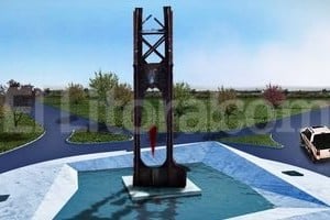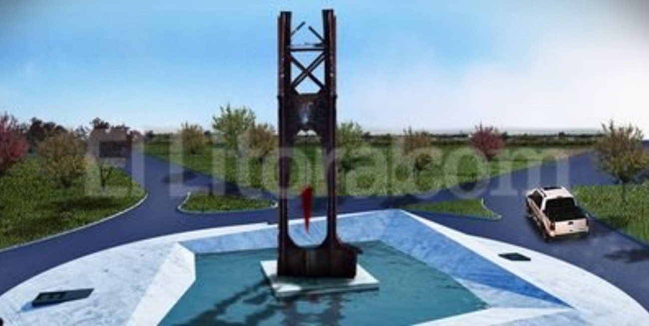 La vieja antena. El artista tratará los restos del Colgante con arena y óxido. Además, se agregará un péndulo de unos dos metros y una fuente. Fotomontaje: El Litoral