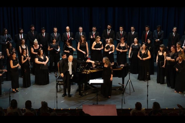 El Polifónico, con Bono al frente presentando a Matías Bustafán, pianista (y también uno de los tenores) del organismo; para este concierto se convocó como segundo pianista al juvenil Franco Broggi. Foto: Gentileza Ministerio de Cultura de Santa Fe