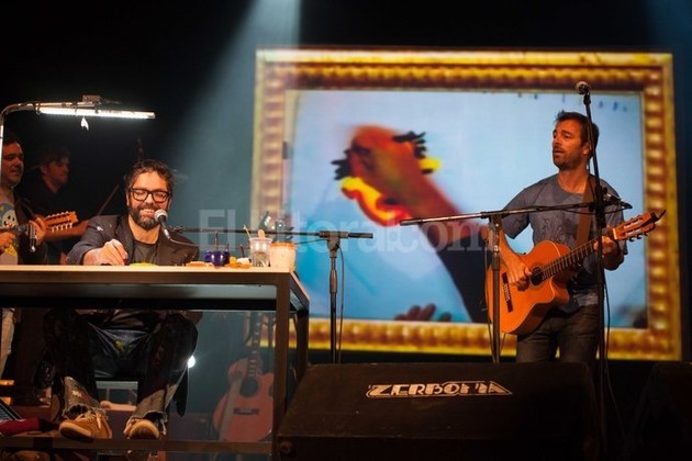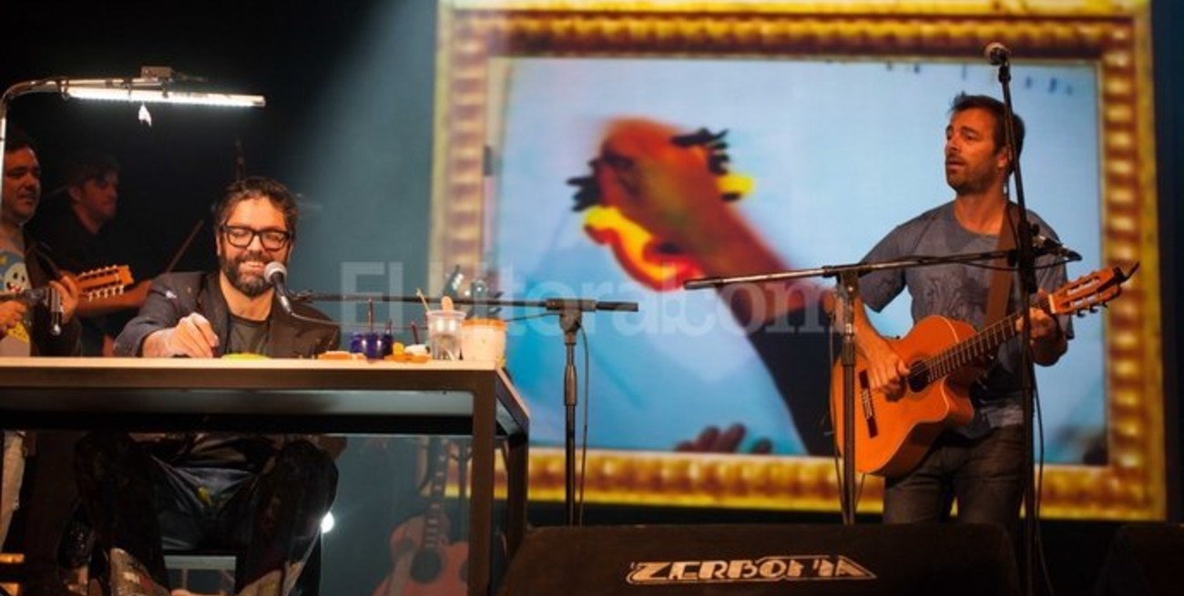 El ukelele empezó a sonar antes de que se abra el telón, y allí estaba parado ese Piojo López de voz grave, con el barbado artista (con ropa manchada de pinturas) dibujando corazones flacos para “Amor finito”. La velada siguió con “Baja a la tierra” (el tema de “Bi” que Johansen grabó con Lila Downs), la cumbia andina glam “En mi cabeza”, con un primer momento de baile y Liniers dejando correr una de sus animaciones. Porque la interacción no es sólo de plástica y música, sino que hay un diálogo constante entre los dos amigos, plagado de humor no necesariamente con corrección política.
