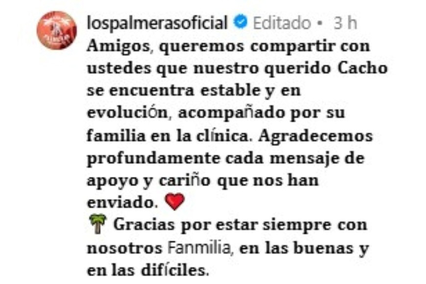 En sintonía con este mensaje desde la familia, la cuenta oficial de Los Palmeras en Instagram emitió un breve comunicado asegurando el buen estado de salud de “Cacho” Deicas.