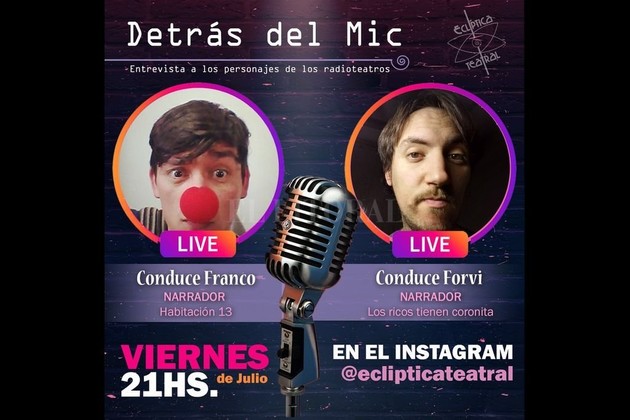 “La propuesta busca ponerle rostro a estas voces desde una entrevista ficcionada donde se prioriza la improvisación y el juego con el público que participe de la transmisión”, explicaron desde el grupo. ¿De qué modo puede participar el público? Conectándose a través de Instagram LIVE los viernes a las 21 con la cuenta de @eclipticateatral. “La transmisión en vivo tendrá una corta duración, priorizando la experiencia virtual y buscando poner foco en el contenido del momento. Los entrevistadores serán el Narrador de “Habitación 13” (Franco Ceci) y el Narrador de “Los Ricos tienen Coronita‘ (Alejandro Fort Villa), entrevistando inicialmente a personajes de los radioteatros de “Los Ricos tienen Coronita” y “¡Reina a la Vista!”, informaron los referentes de Eclíptica.