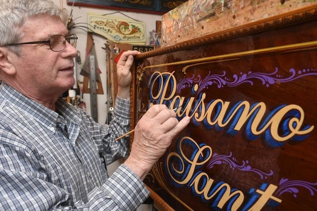 "Mirá, hice este trabajo porque me quiero sumar al homenaje", dice "Peco", con orgullo y satisfacción. Se trata de uno de los últimos fileteadores porteños que hace perdurar este estilo artístico, que fue declarado Patrimonio de la Humanidad por la Unesco.