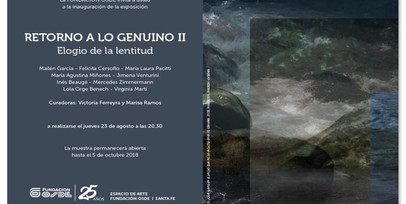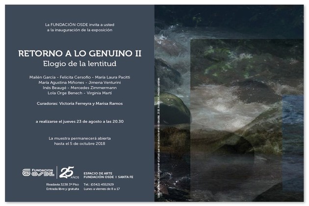 Esrte jueves a las 20,30 hs la Fundación OSDE inaugura Retorno a lo Genuino II, Elogio de la lentitud en el Espacio de Arte de Fundación OSDE Rivadavia 3238, 3 Piso. La muestra quedará hasta el viernes 5 de octubre y podrá visitarse de lunes a viernes de 8 a 17; o comunicarse al teléfono 4552929