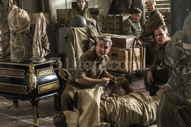 Gentileza 20th Century Fox Protegiendo la cultura: George Clooney y Matt Damon (al frente), Dimitri Leonidas, John Goodman y Bob Balaban (al fondo), rescatando obras de arte de las manos de Hitler.