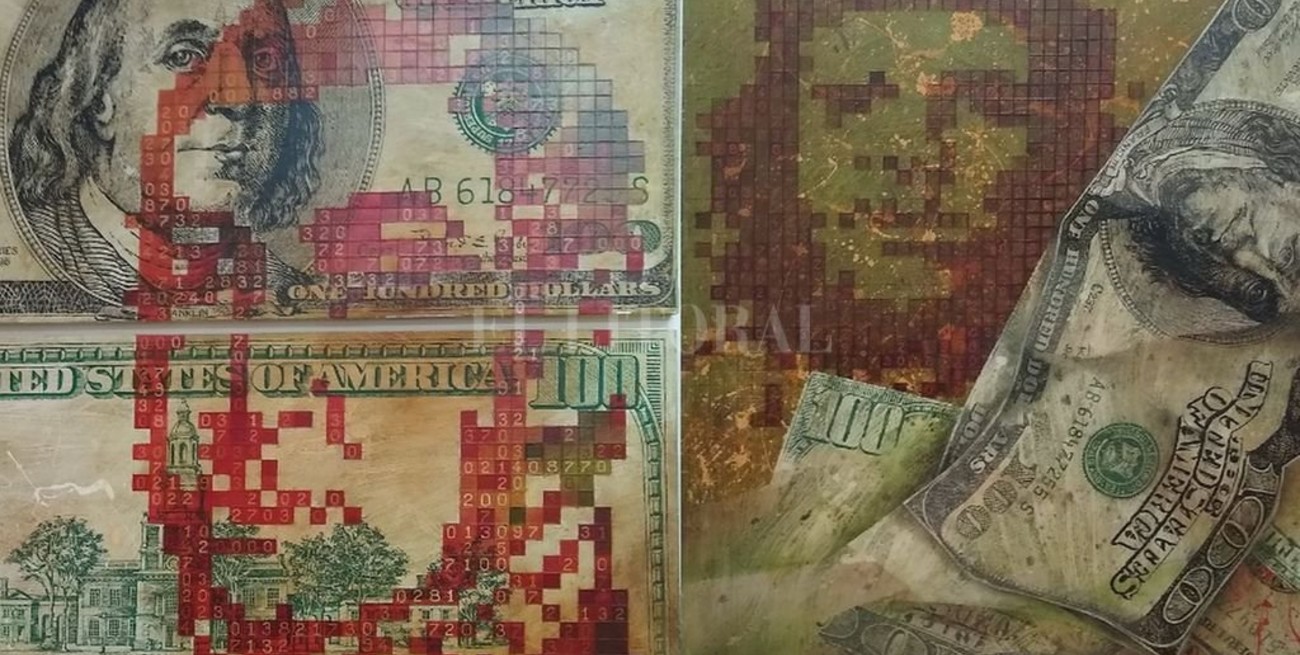 Así, en la obra que muestra un San Martín sobre la imagen de un billete de cien dólares, Hugo Lazzarini utiliza un pixelado con el cual invoca o sugiere la desmaterialización del dinero en formato de pixel, que curiosamente por analogía nos remite a los sistemas bancarios digitales, como lo podría ser el monedero Metamask o la red Polygon, por citar algún ejemplo. Los números elegidos, sugieren el código binario con el cual todo se mueve hoy: desde la PC hasta los sistemas bancarios y satelitales.