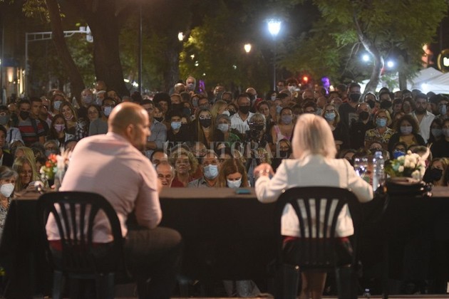 Manuel Fabatía Sarlo exponiendo en la esquina de Lavalle y Bulevar frente a un nutrido público, junto al secretario de Educación y Cultura, Paulo Ricci.