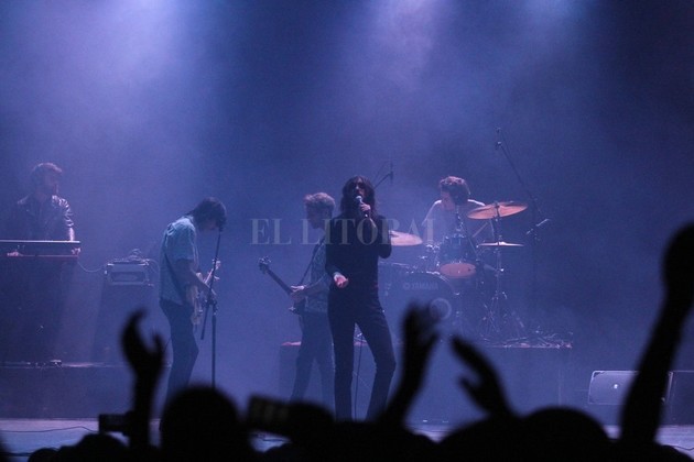 A las 22.45, comenzó la mutación del escenario en asfalto. Luces parpadeantes, del rojo al azul, combinadas con sirenas de ambulancia y policía, fueron la intro audiovisual y escenográfica del ingreso de Indios. En el medio, Joaquín Vitola, vestido de remera y pantalón chupín negros y con medias y cinto rojos. Elegantes y descontracturados, lo acompañaron: adelante, Nicolás de Sanctis (guitarra) y Patricio Sánchez Almeyra (guitarra); detrás, Guillermo Montironi (bajo), Agustín Majdalani (teclados) y Manuel Caizza (batería). “En el asfalto hay” cantó el frontman en la apertura del recital, y cada elemento nombrado componía la escena, reflejo del arribo del grupo pop rock a la capital del país. “Casi desangelados” fue el primer hit interpretado en Santa Fe, dando paso a “Me da miedo el amor” y “Minuto 0”.